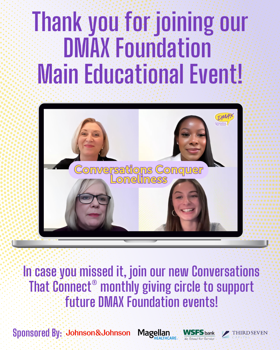 DMAX Foundation proudly hosts its Main Educational Event each spring, bringing together students, professionals, and community members to advance critical conversations around mental health. Our most recent and 11th Annual Main Educational Event, "Conversations Conquer Loneliness," took place virtually on April 23, 2025. Thank you to everyone who joined us and helped make this important evening of connection, learning, and support such a success!